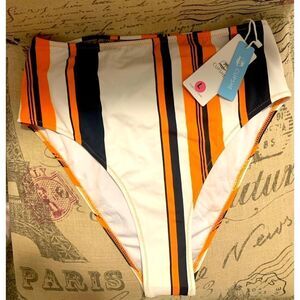 Orange, black, and white striped bralette with removable soft cups and high-waisted extra cheeky bikini bottoms.