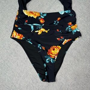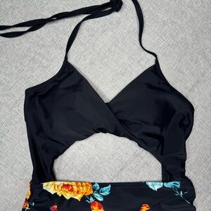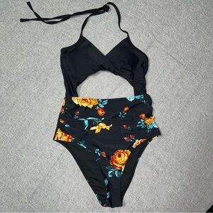 Cupshe Black Floral One Piece Halter Tie Twist Swimsuit. The self-tie halter design allows you to adjust it to your best fit. The cheeky cut on the tummy brings more vigor to this black and floral printed one-piece swimsuit. Size medium. New with tags.