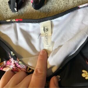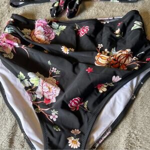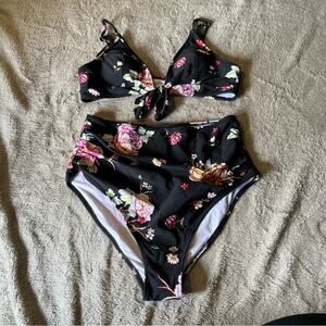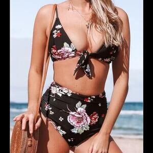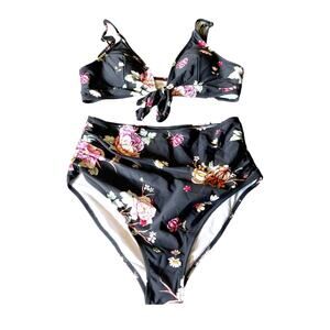 Cupshe Black Floral Tie Front High Waisted Bikini Two Piece Swimsuit Size Large