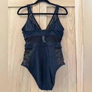 Elegant black swimsuit with mesh accents. Ideal for beach outings. One piece swimsuit with adjustable straps