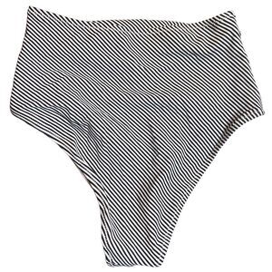 Chic high-waisted bikini bottom. Features elegant stripes. Ideal for a stylish beach day.