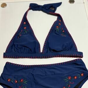 Cupshe Blue Floral Embroidered V Neck Back Hook Bikini Swimsuit NWT Size M