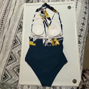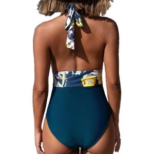 Cupshe Blue Teal Floral Halter Plunge Neck Tummy Control Swimsuit NEW Size S