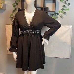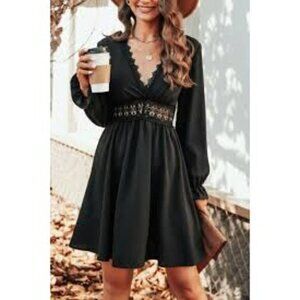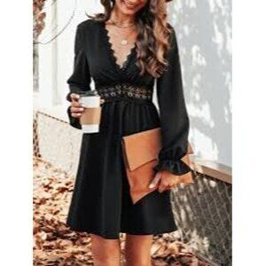 Everyone needs a little black dress and this one guarantees compliments. Featuring a V-neckline, long trumpet sleeves, lace trim, and an A-line silhouette.