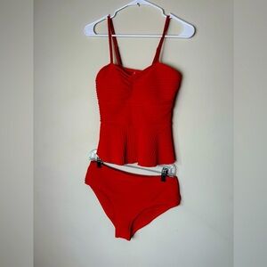 Bold orange swimwear with unique texture. Perfect for beach days. Adjustable straps, removeable cups, full coverage bottoms.