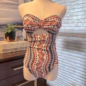 Great one piece bathing suit with pretty bohemian print. Removeable molded cups and detachable straps - so can be worn tied as halter or removed to wear as a strapless bathing suit.