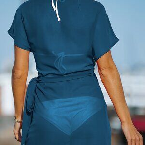 Cupshe Day Glow Blue Cover-Up Mini Dress in size M is a breezy, beach-ready essential. Designed with a flattering surplice neckline, short sleeves, and an adjustable waist tie, this woven mini dress offers the perfect blend of comfort and style for all your seaside getaways. Lightweight 100% polyester fabric makes it an easy throw-on over any swimsuit.