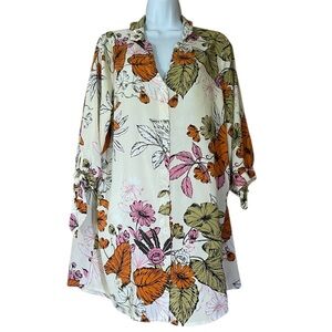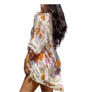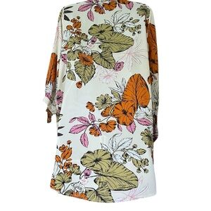Stay stylish at the beach with this floral print swim cover-up. Featuring vibrant orange and pink hues, it's perfect for a sunny day. Lightweight and comfortable, this cover-up is a must-have for your swimwear collection.