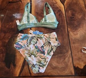 Sage green bikini top with scalloped edges. Leaf print high-waisted, full coverage bottom. approximate measurements: