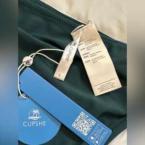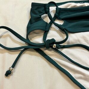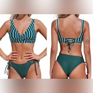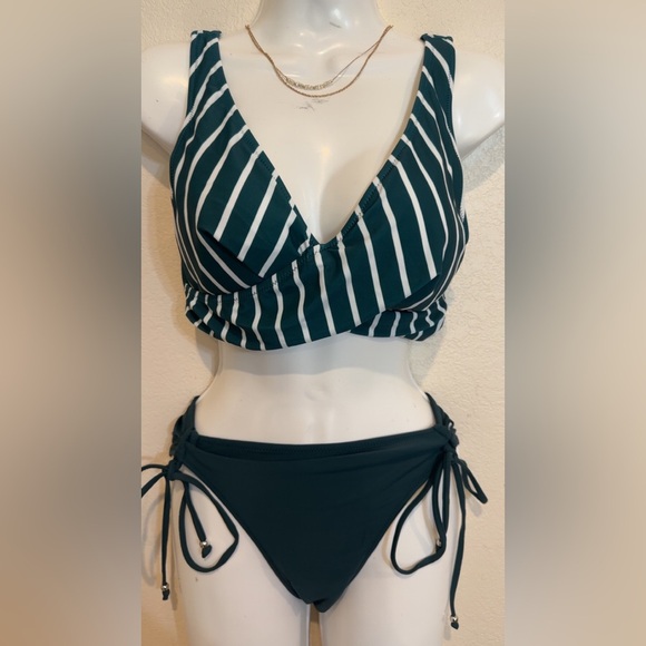 Stylish green and white striped bikini. Features a flattering top and adjustable bottoms. Perfect for beach days. No flaws.