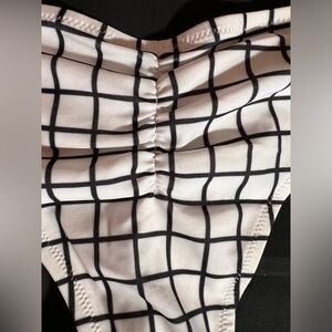 Cupshe bikini bottom in a chic black grid print on white. Features a flattering ruched back seam and cheeky cut for a sculpted fit. Fully lined. Brand new with tags attached but no hygienic liner present.