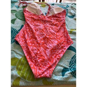 Cupshe Halter Neck Coral Pink Floral One-Piece Swimsuit Ruched Front Size Large NWOT