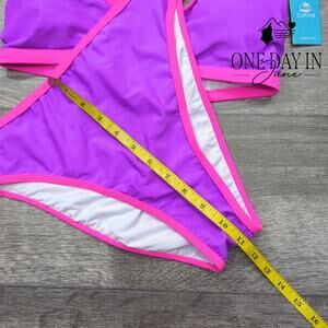 This enchanting purple bikini captures the essence of summer glamour with its daring high-cut silhouette and alluring keyhole detail. Crafted from a luxurious polyester-spandex blend, it promises both comfort and sophistication for the modern woman who seeks to make a statement by the water's edge. A pristine piece that embodies the spirit of carefree elegance and timeless allure.