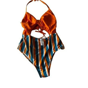 Cupshe Kylie Halter Lace Up Twist One Piece Swimsuit Size L orange blue stripe