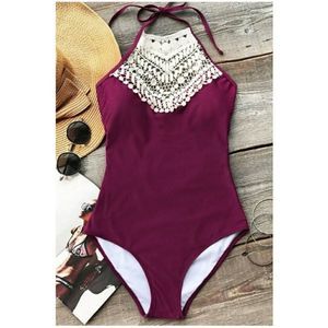New with tags from Cupshe. Stored smoke free. Deep merlot colored suit with halter tie neck. Removable padding. Tie back. Creamy boho crochet neckline detail. Size small.