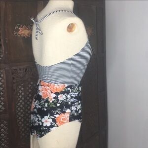 Oh hey adorable swim suit! Cupshe floral bottom, black & white striped top, one piece bathing suit. Cutout of front with tie halter top. Light padding