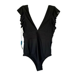 Black one piece swimsuit. V-neck and v-back. Ruffle flutter sleeve. Mesh waist. Removable padding.