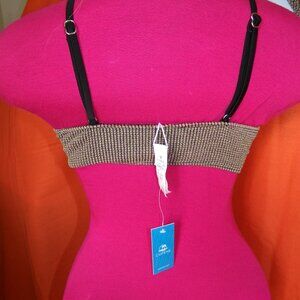 Top has adjustable straps & place for removable pads (not included). Makeup smudge on the inside (look like from someone trying it on). Bottoms have moderate coverage.