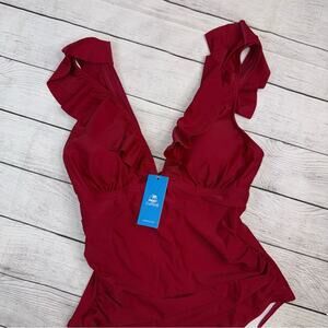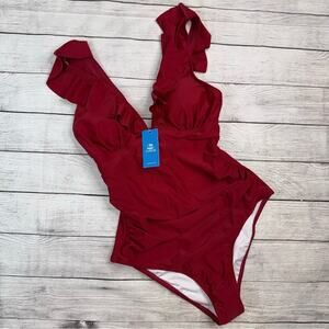 Cupshe NWT Ruffled One-Piece Swimsuit with Lace Up Back Burgundy Size Medium