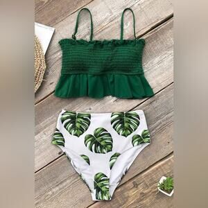Cupshe NWT Smocked Green Bikini Set with High Waist Leaf Bottoms Size Small