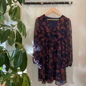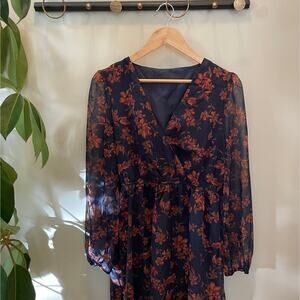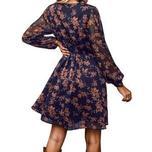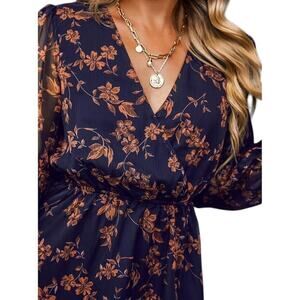 Brand new with tags (NWT) Cupshe floral chiffon dress in navy blue, size medium. This romantic and elegant dress features a beautiful rust-orange floral print on a flowy chiffon fabric. The wrap-style V-neckline and sheer long sleeves with elastic cuffs create a flattering silhouette, while the elastic waistband adds comfort and shape.