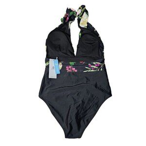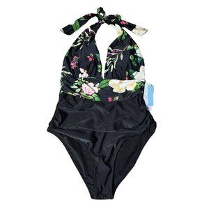 Cupshe One Piece Floral Swimsuit Halter Black Plunging Neckline Women's Large
