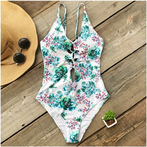 Cupshe One Piece Swimsuit L Lace Up Keyhole Blue Roses Flower Vacation NEW