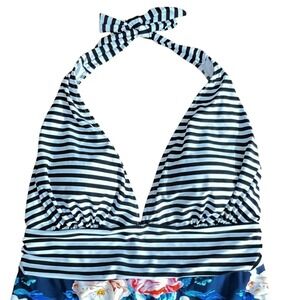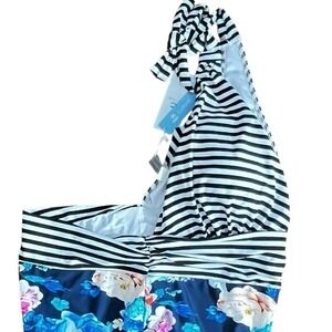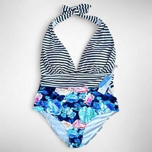 Cupshe One Piece Swimsuit Womens 2X Halter Floral Stripe Blue Black Bathing Suit