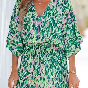 Unique Design: Unleash your wild side with our lace up abstract print romper, a fierce and fabulous ensemble adorned with a bold leopard print, a waist-cinching belt, v neck, half dolman sleeves and loose fit style, ensuring you'll make a fashion statement with every step and turn heads wherever you go