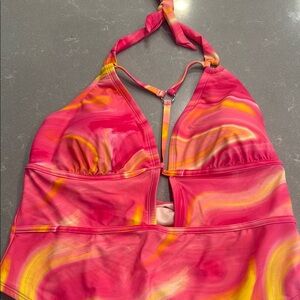 Embrace the vibrant charm of this Cupshe one-piece swimsuit, showcasing a stunning blend of pink and yellow hues. The classic scoop neckline offers a timeless appeal, while the dynamic color pattern ensures you stand out at any poolside or beach gathering.