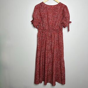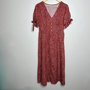 Features: polka dots, short sleeves, tie sleeves, buttons down the front, maxi ankle length, v-neck, smocked stretchy waist