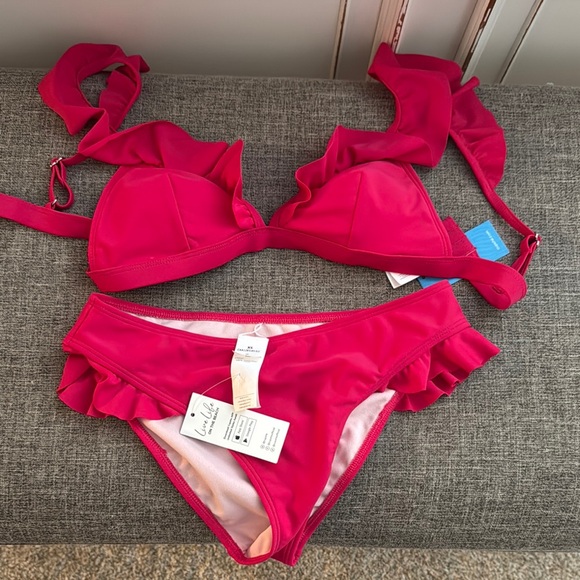 Stylish red bikini set with ruffle details. Perfect for beach days. New with tags. Protective sticker lining on bottom has been taken off.