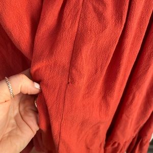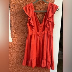 Chic red mini dress. Features ruffle details. Perfect for any occasion.