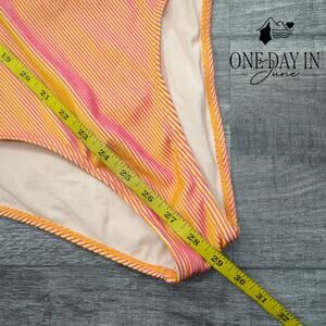 A most charming ribbed one-piece swimsuit in a spirited orange hue that would surely turn heads at any seaside gathering or garden party by the water. This delightful Cupshe creation combines the comfort of soft polyester with the flattering stretch of spandex, ensuring both elegance and ease of movement for the discerning lady. New with tags and ready to accompany you on your most fashionable aquatic adventures.