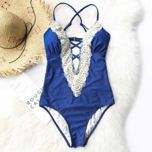 New with tags from Cupshe. Stored smoke free. Gorgeous royal blue one piece with creamy lace trim at bodice. Deep neckline. Removable padding.