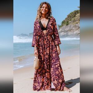 Cupshe Sally Floral Plunge Maxi Dress. Size medium. 100% rayon. Purple and coral flower print, deep neckline, high hem, lightweight, pullover style. NWT