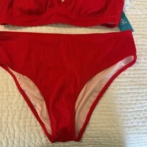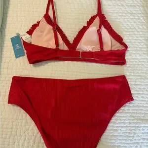 Ribbed triangle top with delicate ruffle trim. Matching mid-rise bottoms for balanced coverage. Stretchy fabric for comfortable wear. Vibrant scarlet hue for bold summer style.