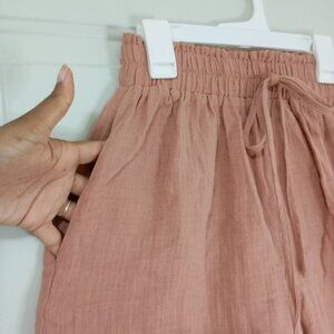 Crafted from breathable cotton, these rust-brown shorts feature a delicate crochet trim and an adjustable drawstring waist, offering a blend of style and comfort.