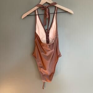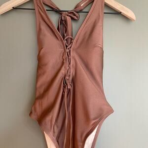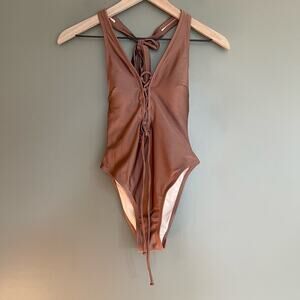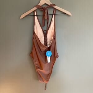 Cupshe Strawberry Fields Forever Back Tie One Piece Swimsuit in Brown, Bronze Rose Gold Color, Halter Neck, Lace Up Front, Plunging Neckline, Size XS