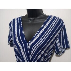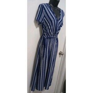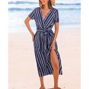 The Cupshe Striped Crossover Wanderer Maxi Dress in size M is a stylish and lightweight swim coverup perfect for the beach or casual occasions. Made from rayon fabric, this V-neck dress features a blue and white striped pattern, short sleeves, and a pullover closure. The long dress length and belted waist add a touch of sophistication to its beachy and colorful theme, making it a versatile and comfortable option for summer and spring seasons. Machine washable for easy care, this dress is a must-have addition to any woman's wardrobe.