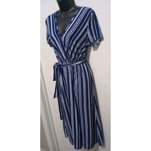 Cupshe Striped Crossover Dress Long Sz M Swim Coverup Beachy Blue White Striped