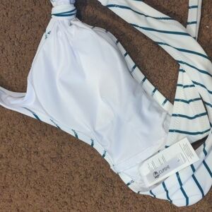 Cupshe teal and white striped halter bikini top and teal bottoms with ruched sides. New with tags