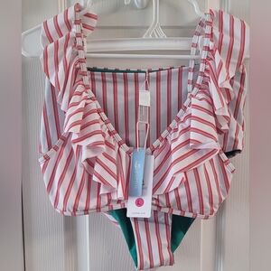 Red and white stripes with a green interior lining Ruffled top, bikini set