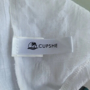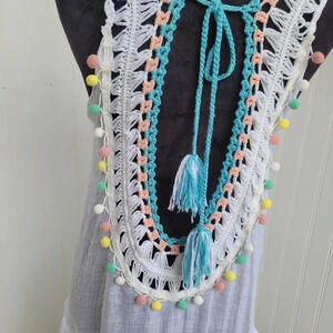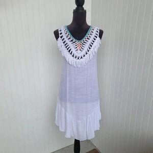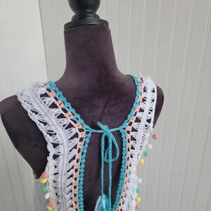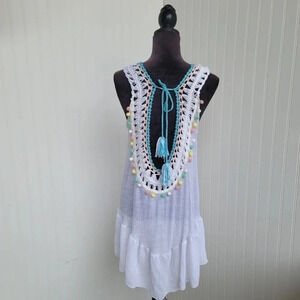 Cupshe Swim Coverup Dress One Size Boho Crochet Pom Pom Fringe Tassel White Blue