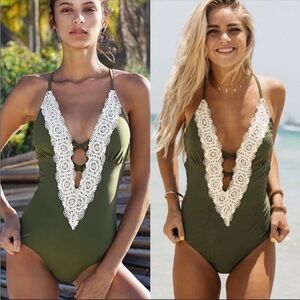 Cupshe Swim Olive Green Plunge Vintage Lace One Piece Swimsuit Size Small NWOT