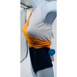 "Elevate your beach style with this new-with-tags Cupshe swimsuit. Featuring a navy blue bottom and a vibrant yellow and white fabric crossover on the top, this swimsuit exudes summer chic. The side-tie belt adds a touch of flair, while the v-neck and v-back design enhance its allure. Available in a medium size, this swimsuit offers a comfortable fit without adjustable straps. Make a statement by the water in this stylish and trendy swimwear piece."