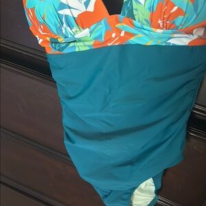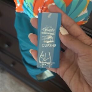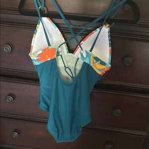 Stylish one-piece swimsuit by Cupshe. Features a vibrant floral pattern with teal base. Perfect for beach days.