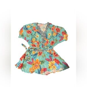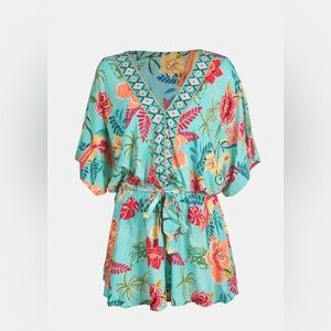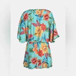 Embrace sunshine in this lightweight and breezy romper designed for effortless style and comfort. Featuring a vibrant tropical floral print, this romper includes a plunging V-neckline with embroidered trim, wide flutter sleeves, and a self-tie waist to flatter your shape.