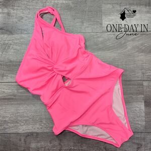 This pretty pink piece with a twist so neat, makes poolside lounging oh-so sweet! One shoulder style that's fresh and new, this swimsuit stunner is waiting for you!