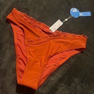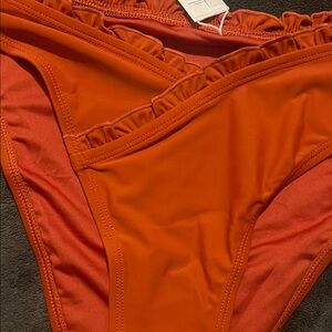 Bright orange bikini bottom with playful ruffles. Ideal for beach days.